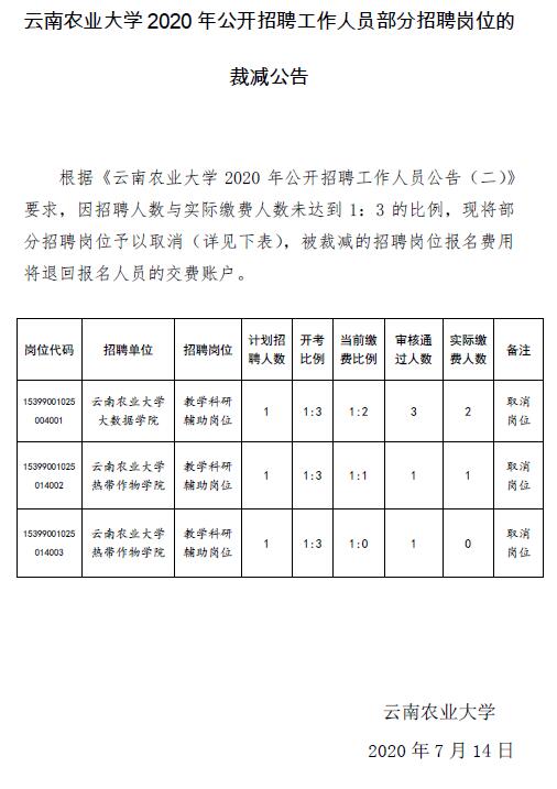 云南農(nóng)業(yè)大學(xué)2020年公開招聘工作人員部分招聘崗位的裁減公告