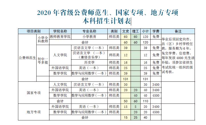 2020年省級公費師范生、國家專項、地方專項本科招生計劃表