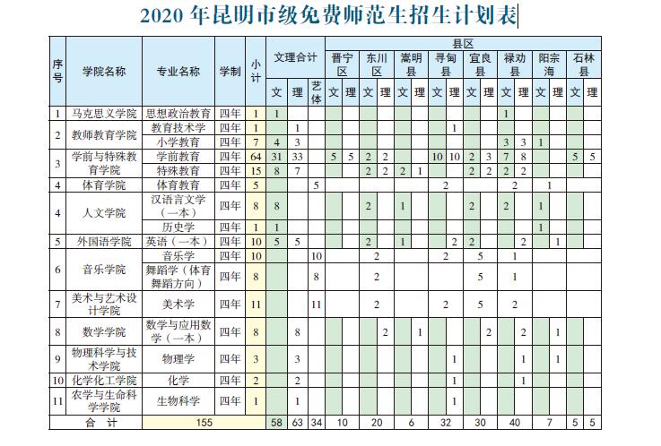 2020年昆明市級免費師范生招生計劃表