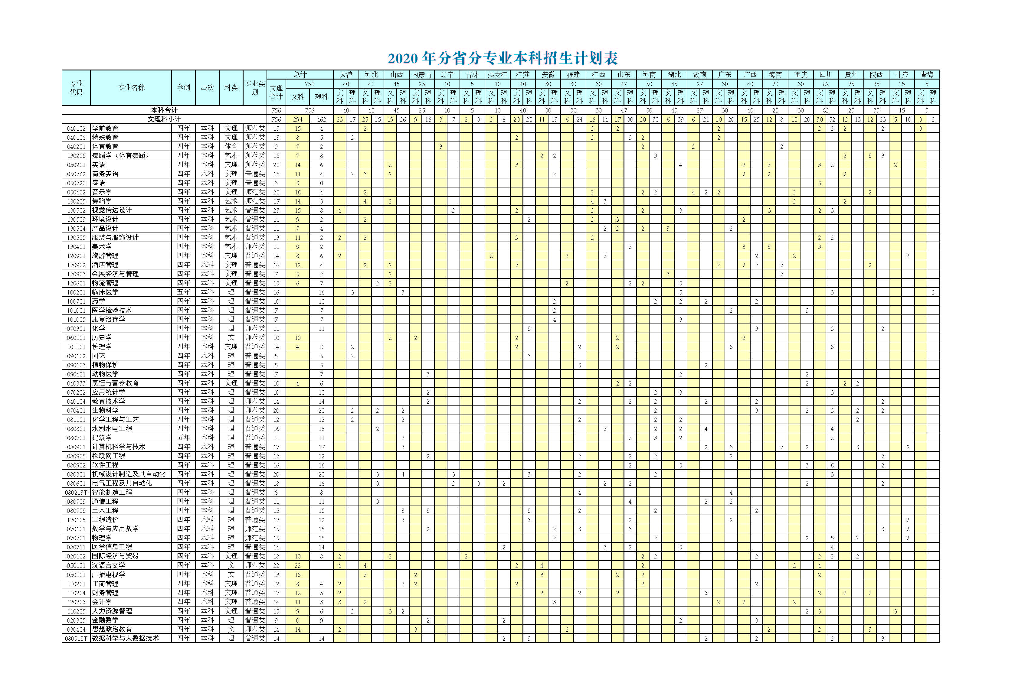 2020年分省分專業(yè)本科招生計(jì)劃表