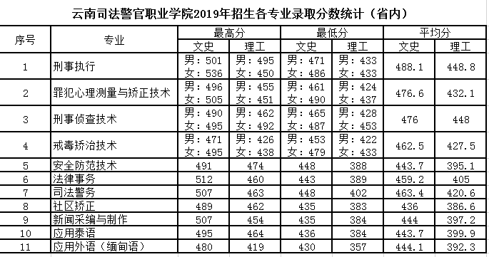 云南司法警官職業(yè)學(xué)院2019年招生各專業(yè)錄取分?jǐn)?shù)統(tǒng)計(jì)(省內(nèi))