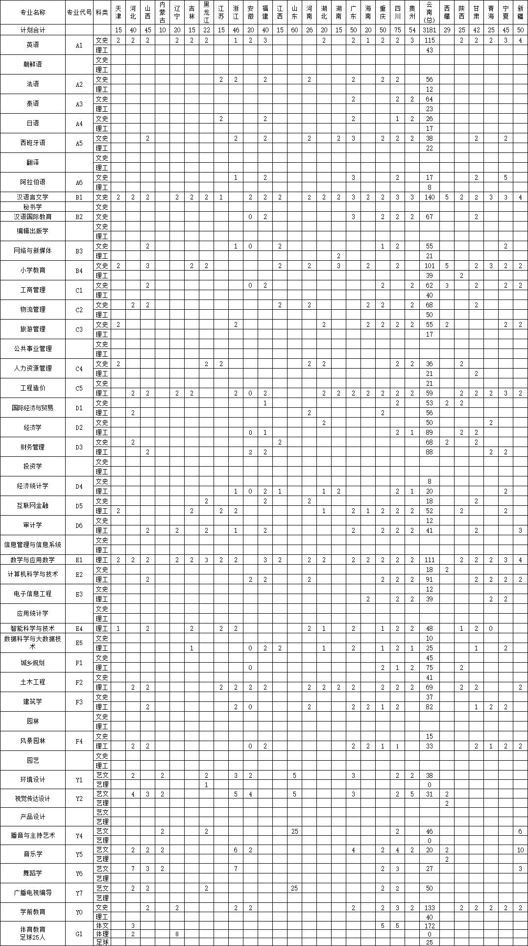 云南師范大學文理學院2020年分省分專業(yè)方向招生計劃一覽表