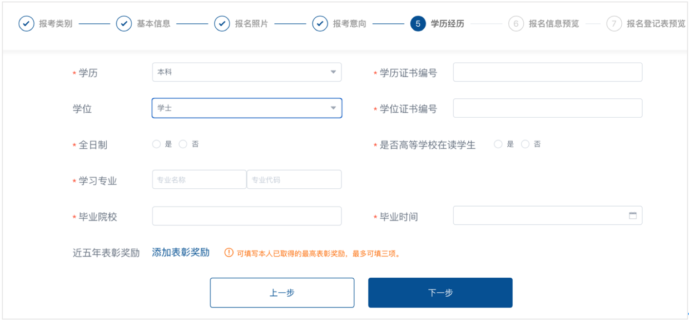 學歷包括研究生、本科、大專、高中(中專、職高),選擇研究生及本科的需填寫學歷編號、學位及學位編號、是否全日制、是否高等學校在讀學生、學習專業(yè)名稱及代碼。所有招錄對象均需填寫畢業(yè)院校、畢業(yè)時間、現(xiàn)工作單位、參加工作時間、是否從事過消防工作。從事過消防工作的,還需填寫工作類型及消防工作年限。工作類型分為政府合同制、企業(yè)專職隊、森林防火員及其他。“近五年表彰獎勵”欄目可填寫本人已取得的最高表彰獎勵,最多可填3項。表彰內容需完善表彰類型、項目名稱、施獎單位、表彰時間、表彰事由。