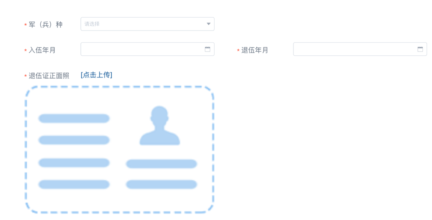 報名類型為“退役士兵”的招錄對象需填寫服役的軍(兵)種、入伍時間、退役時間(具體到年月),系統(tǒng)自動計算服役年限,同時還須上傳退伍證帶有個人照片和信息的正面照。軍(兵)種分為解放軍和武警部隊、原公安消防部隊、原武警森林部隊。