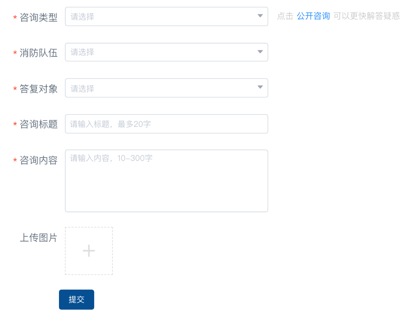 系統(tǒng)注冊人員可在【咨詢投訴】中提問,提問需填充的內容包括咨詢類型、消防隊伍、答復對象、咨詢標題、咨詢內容,還可上傳說明圖片。需先選擇“消防隊伍”才可選擇“答復對象”。