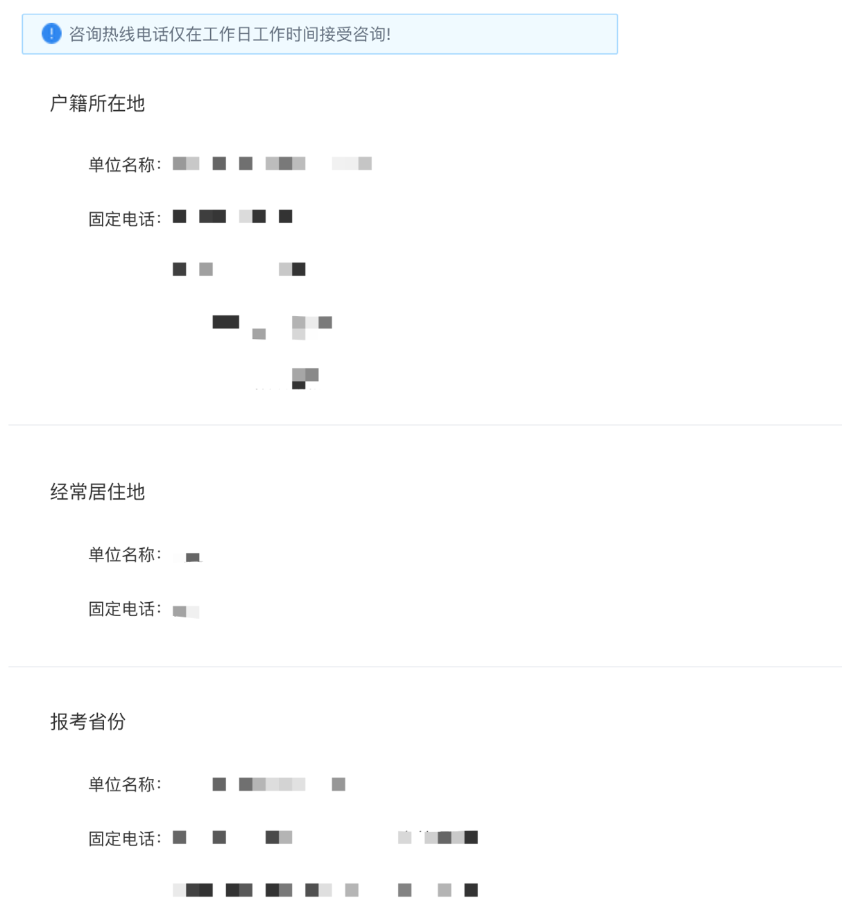 報名成功人員可在個人中心咨詢熱線處查看戶籍地、經(jīng)常居住地及報名單位所在地的咨詢熱線信息,包括單位名稱、固定電話。