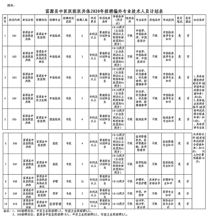 詳見附件《富源縣中醫(yī)醫(yī)院醫(yī)共體2020年招聘編外專業(yè)技術(shù)人員計劃表》。