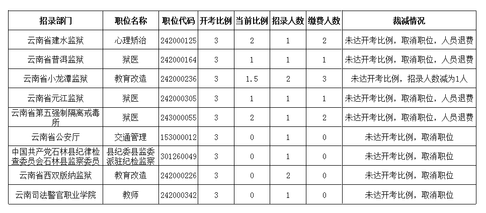 云南省2020年度考試錄用公務(wù)員報(bào)名資格審查及繳費(fèi)工作已經(jīng)結(jié)束。根據(jù)《云南省2020年度考試錄用公務(wù)員公告》有關(guān)公共科目筆試開(kāi)考比例規(guī)定,對(duì)實(shí)際繳費(fèi)人數(shù)與計(jì)劃招錄人數(shù)比例未達(dá)到開(kāi)考比例的招錄職位計(jì)劃予以裁減或取消,截止至2020年7月19日24時(shí)繳費(fèi)結(jié)束,結(jié)合各職位實(shí)際報(bào)名繳費(fèi)情況,決定裁減1名職位計(jì)劃,取消9名職位計(jì)劃,對(duì)6名人員予以退費(fèi)?,F(xiàn)將錄用計(jì)劃裁減及取消具體情況通告如下: