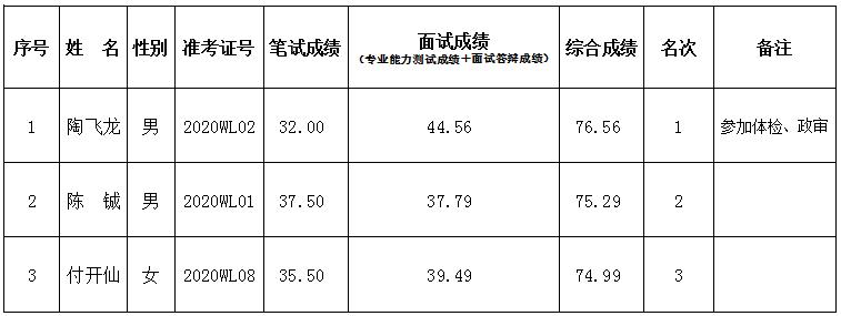 綜合成績(jī)總分為100,其中筆試成績(jī)占50%、面試答辯成績(jī)占10%、專業(yè)能力測(cè)試成績(jī)占40%(綜合成績(jī)=筆試成績(jī)×50%+面試答辯成績(jī)×10%+專業(yè)能力測(cè)試×40%)。所有成績(jī)按四舍五入保留兩位小數(shù)進(jìn)行計(jì)算。如出現(xiàn)綜合成績(jī)相同情況,以筆試成績(jī)較高者優(yōu)先。綜合成績(jī)第一名參加體檢、政審。