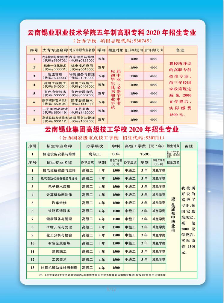 云南錫業(yè)職業(yè)技術(shù)學(xué)院五年制高職???、云南錫業(yè)集團(tuán)高級(jí)技工學(xué)校2020年招生簡(jiǎn)章