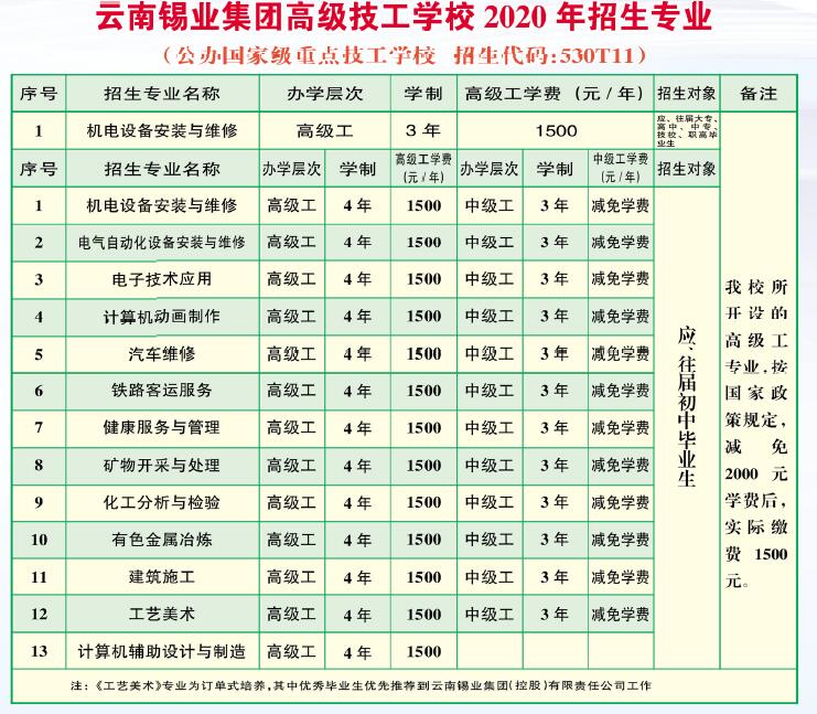 云南錫業(yè)集團(tuán)高級(jí)技工學(xué)校2020年招生專業(yè)