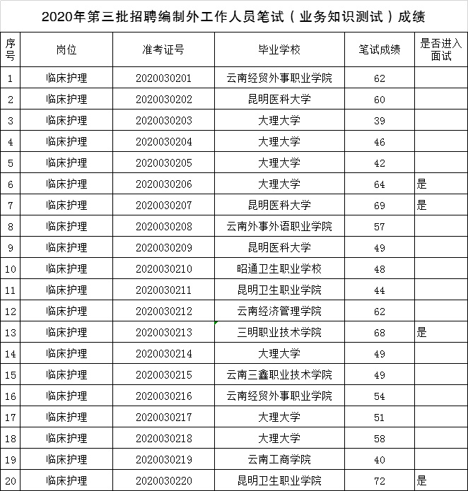 2020年第三批招聘編制外工作人員筆試(業(yè)務知識測試)成績 來源:http://www.ynyxyjzyy.com/yuanjiang/xwzx/tzgg/276.html