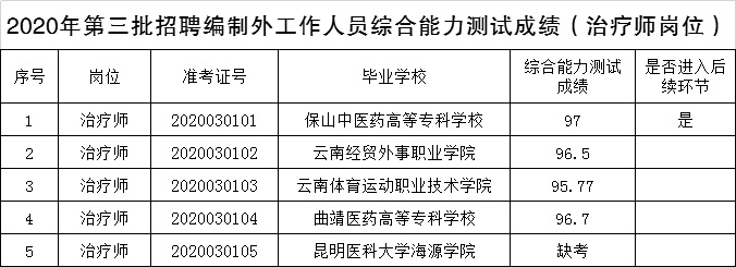 2020年第三批招聘編制外工作人員綜合能力測試成績(治療師崗位) 來源:http://www.ynyxyjzyy.com/yuanjiang/xwzx/tzgg/279.html