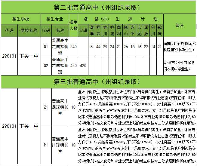 1、按照大理州教育體育局下達(dá)的招生計(jì)劃,我校2020年面向大理州內(nèi)招收660名新生。其中240名面向大理市以外的11個(gè)縣招收應(yīng)屆初中畢業(yè)生,各縣招生計(jì)劃指標(biāo)由大理州招生考試院下達(dá);其他420名學(xué)生,面向大理市轄區(qū)鄉(xiāng)鎮(zhèn)招生。