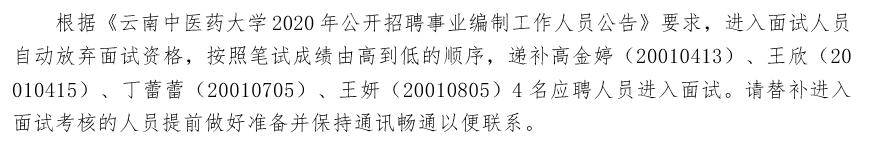 根據(jù)我校2020年公開招聘事業(yè)編制工作人員安排,2020年7月31日,我校在官網(wǎng)上發(fā)布筆試考核成績及進(jìn)入面試人員名單,黨委組織部、黨委統(tǒng)戰(zhàn)部、黨校、扶貧辦(合署)002—03崗位共有10人進(jìn)入面試。部門面試開始前,應(yīng)聘人員師越、余姝含因個人原因放棄面試資格。