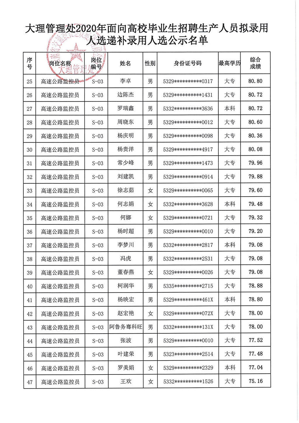 云南交投集團大理管理處2020年招聘擬錄用(遞補)名單公示