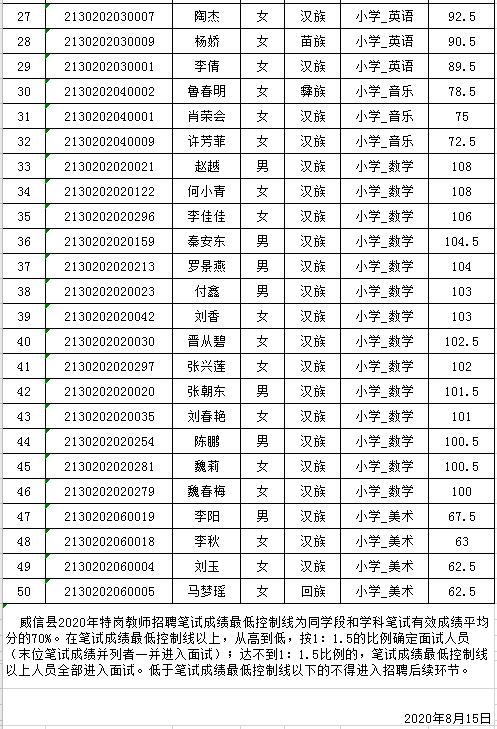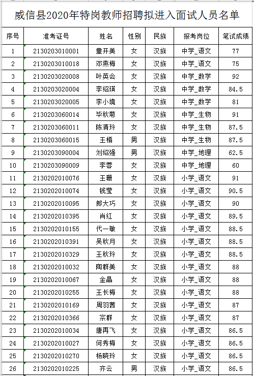 1.威信縣2020年特崗教師招聘擬進(jìn)入面試人員名單