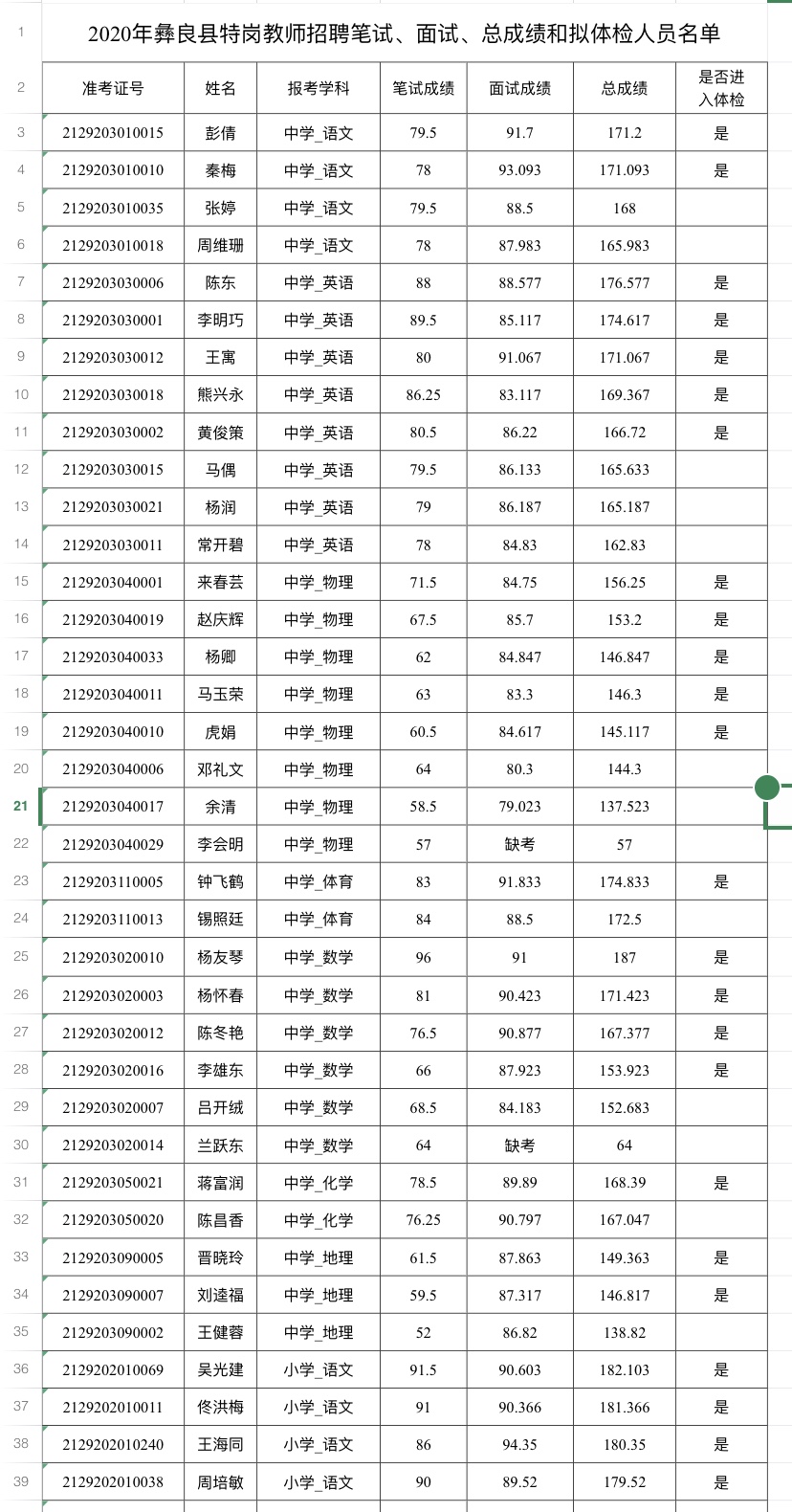 附件:2020年彝良縣特崗教師招聘筆試、面試、總成績(jī)和擬體檢人員名單.xls