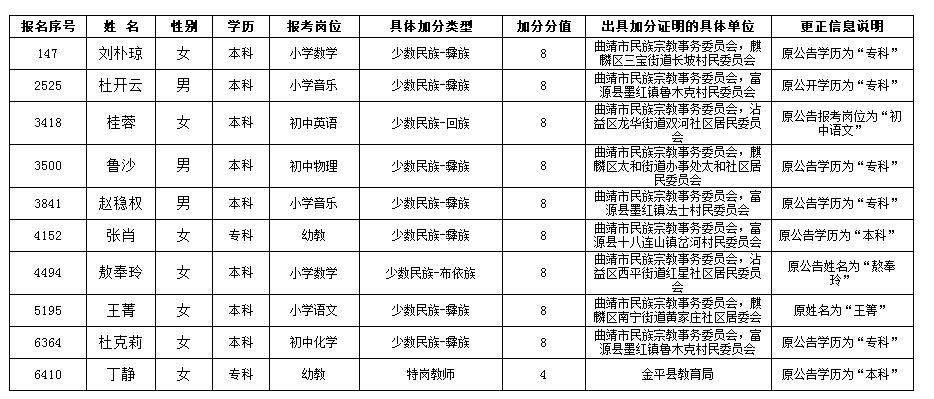 2020年8月13日由曲靖市人力資源和社會(huì)保障局公告的《陸良縣2020年公開招聘教師筆試成績政策性加分人員及分值公告》中的部分人員信息需予以更正,具體情況如下: