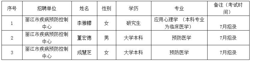 為進(jìn)一步充實(shí)和優(yōu)化麗江市醫(yī)療衛(wèi)生人才隊(duì)伍,經(jīng)市人社、市委編辦核準(zhǔn),麗江市衛(wèi)生健康委直屬的醫(yī)療衛(wèi)生單位分別于2020年1月、3月、7月開展了急需緊缺人員校園招聘、網(wǎng)絡(luò)招聘等招聘工作,現(xiàn)對經(jīng)面試、考察、體檢合格的第二批擬聘人員3人的名單進(jìn)行公示。