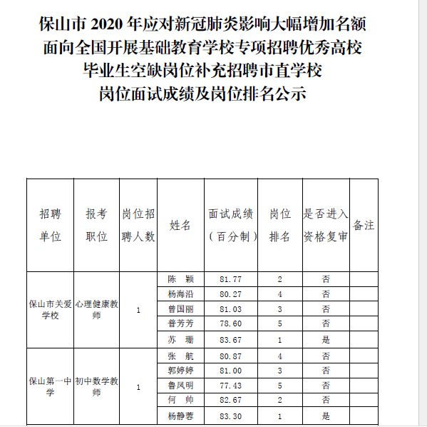保山市2020年基礎(chǔ)教育學(xué)校專項(xiàng)補(bǔ)充招聘市直學(xué)校崗位面試成績(jī)公示