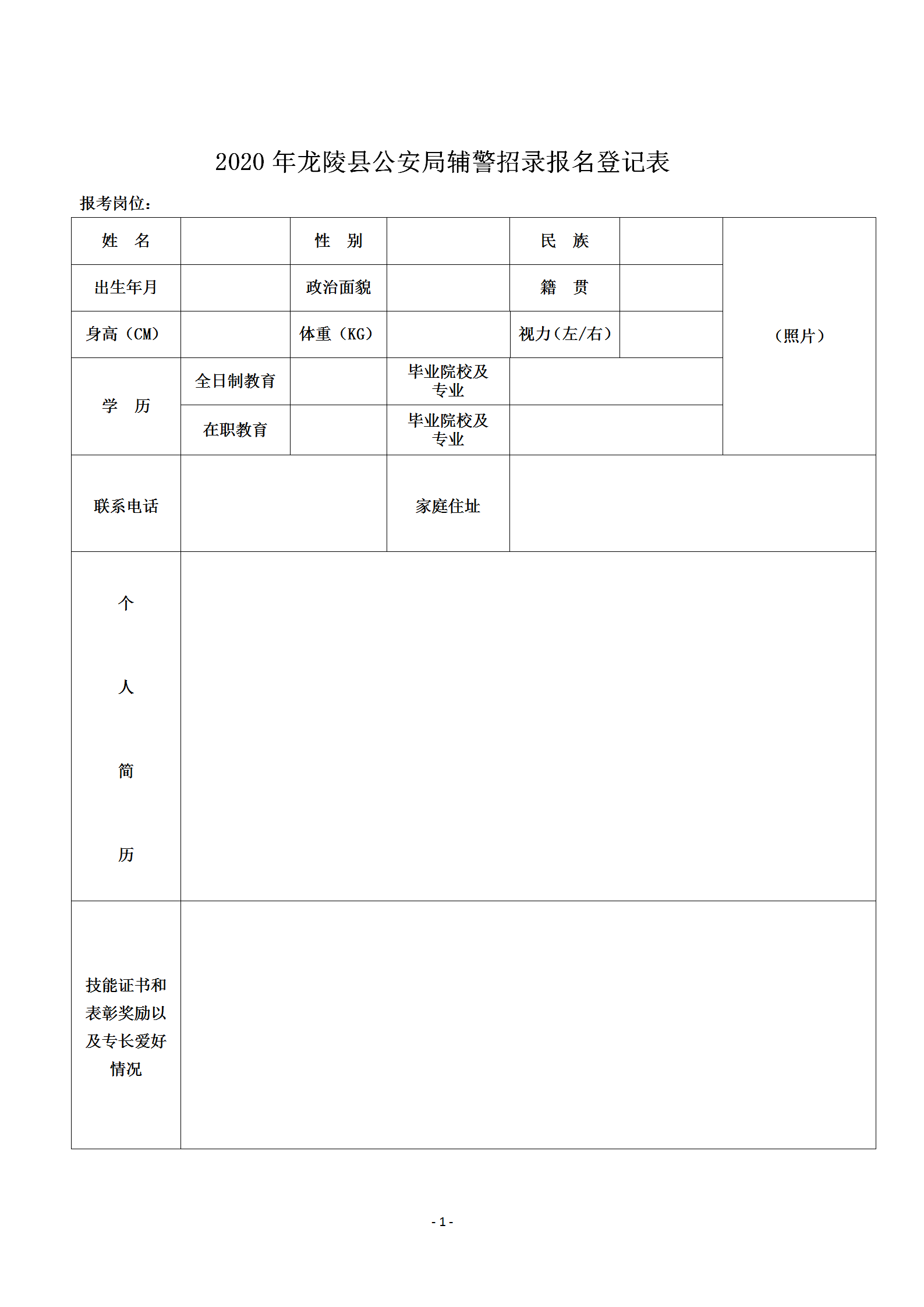 (2)報名時需本人持身份證(或戶口簿、戶籍證明)、畢業(yè)證原件及所報考崗位條件要求的其他證明材料原件及復(fù)印件1份(A4紙張),現(xiàn)場填寫《龍陵縣公安局警務(wù)輔助人員報名登記表》,已經(jīng)就業(yè)人員需出具原單位同意報考證明;