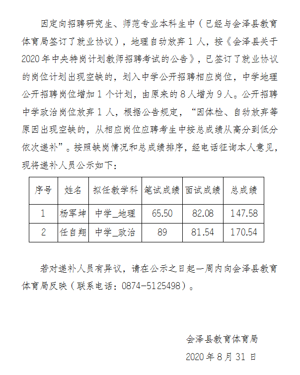 會(huì)澤縣2020年中央特崗計(jì)劃教師招聘遞補(bǔ)人員公示(一)