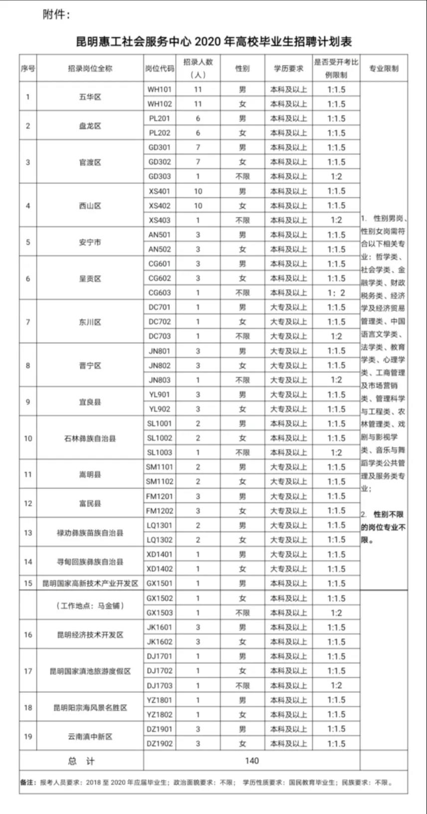 2.招聘人數(shù)、學(xué)歷要求、性別要求、專業(yè)限制等詳見附件《昆明惠工社會(huì)服務(wù)中心2020年高校畢業(yè)生招聘計(jì)劃表》(性別男崗位、性別女崗位受專業(yè)限制,性別不限崗位專業(yè)不限)。