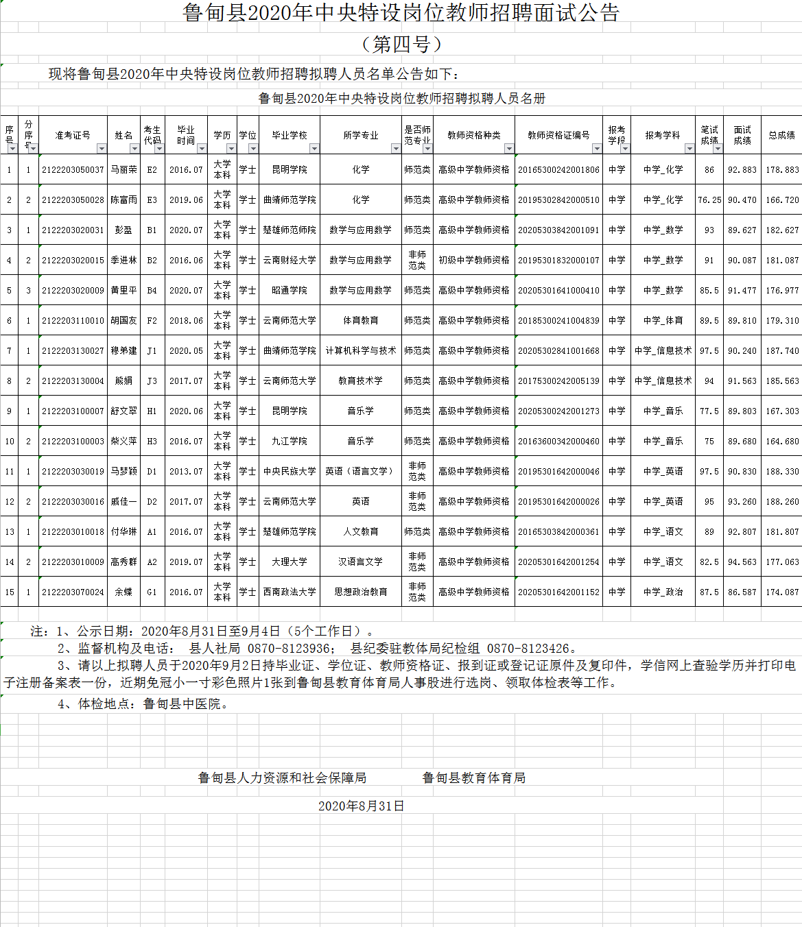 昭通市魯?shù)榭h2020年中央特設崗位教師招聘擬聘人員名單公告