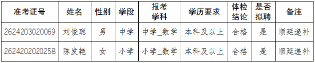 根據(jù)《文山州2020年特崗教師招聘公告》《麻栗坡縣2020年特崗教師招聘面試公告》《麻栗坡縣2020年特崗教師招聘綜合成績及擬聘人員體檢事項公告》《麻栗坡縣2020年特崗教師招聘擬聘特崗教師及選崗工作等調(diào)整相關(guān)事項公告》規(guī)定,因體檢不合格1人,自愿放棄擬聘資格1人,順延遞補(bǔ)2人。現(xiàn)將順延遞補(bǔ)人員名單公告如下: