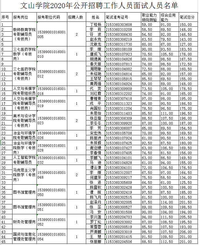 附件:文山學(xué)院2020年公開招聘工作人員面試人員名單