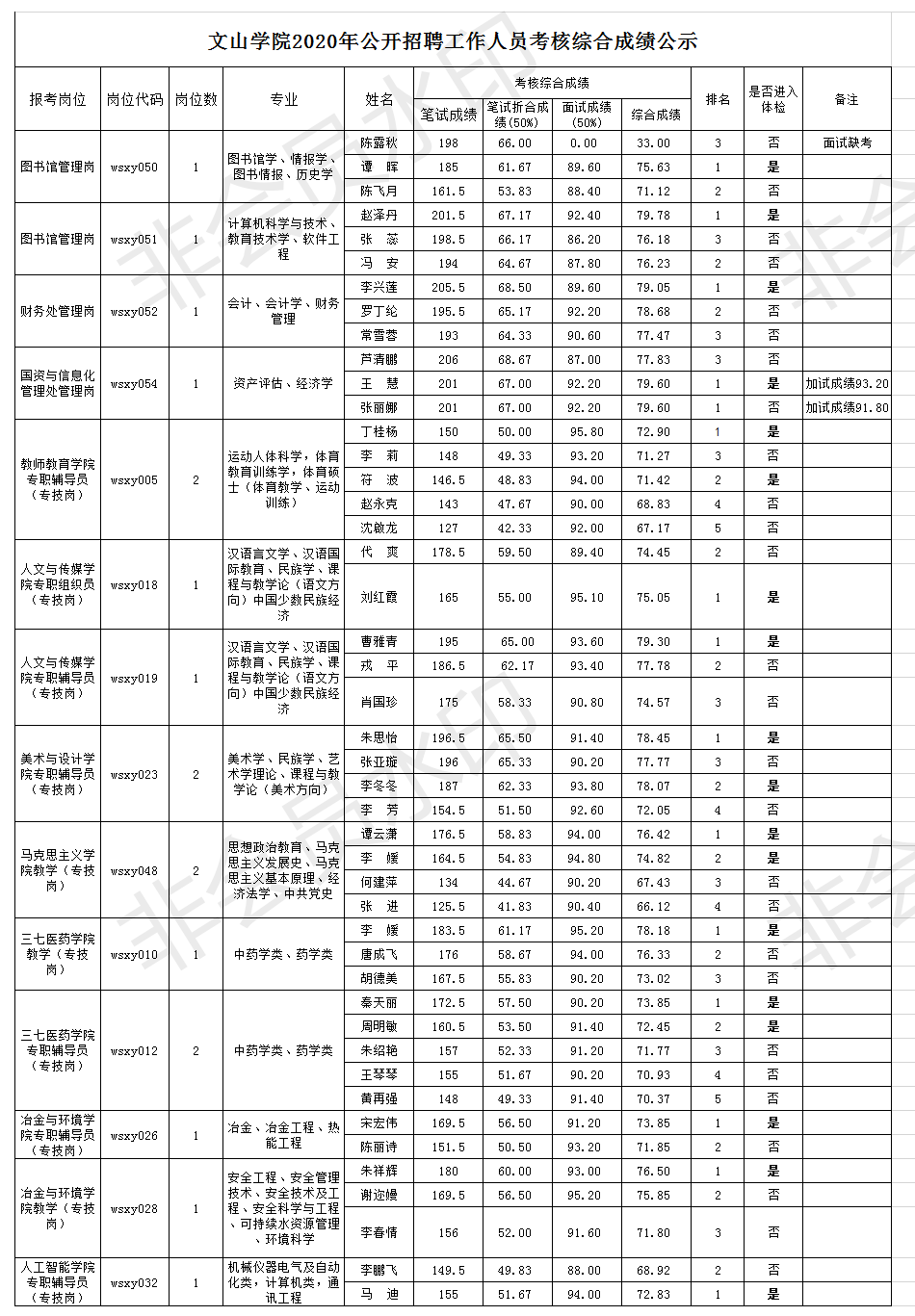 文山學院2020年公開招聘工作人員考核綜合成績公示