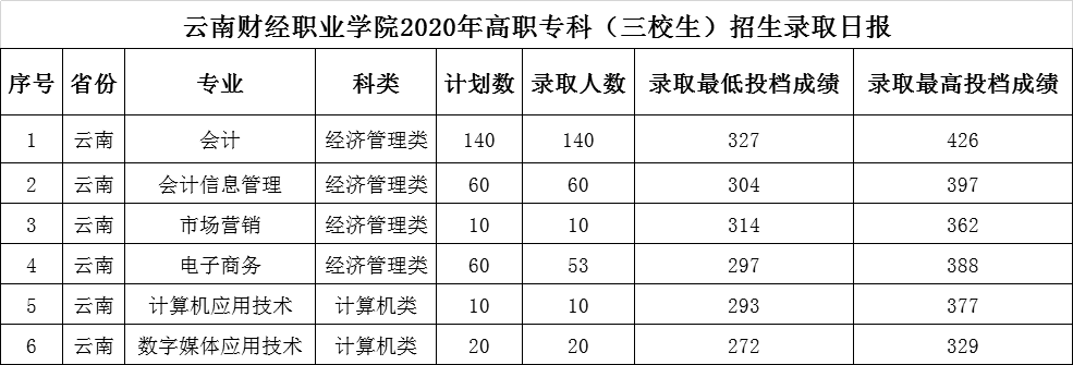2020年云南財經(jīng)職業(yè)學(xué)院各專業(yè)錄取分