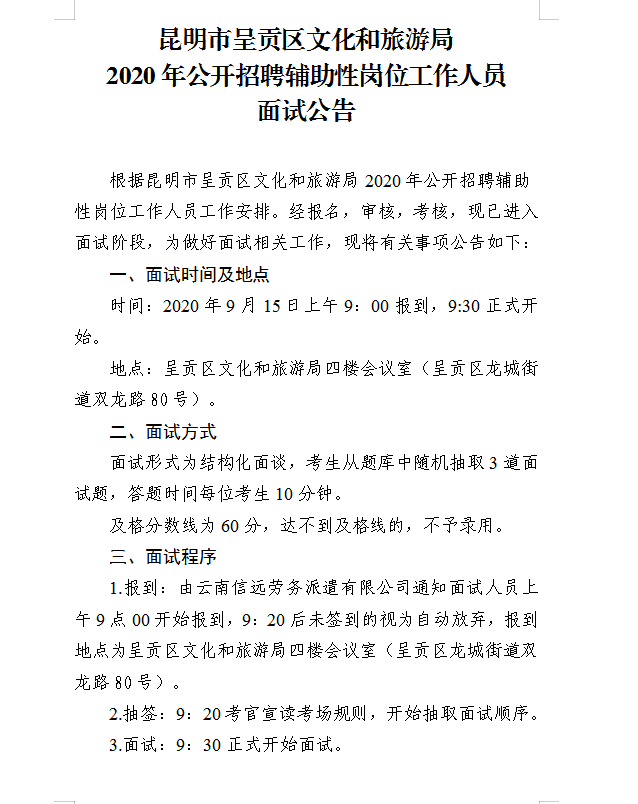 昆明市呈貢區(qū)文化和旅游局2020年公開(kāi)招聘輔助性崗位工作人員面試公告