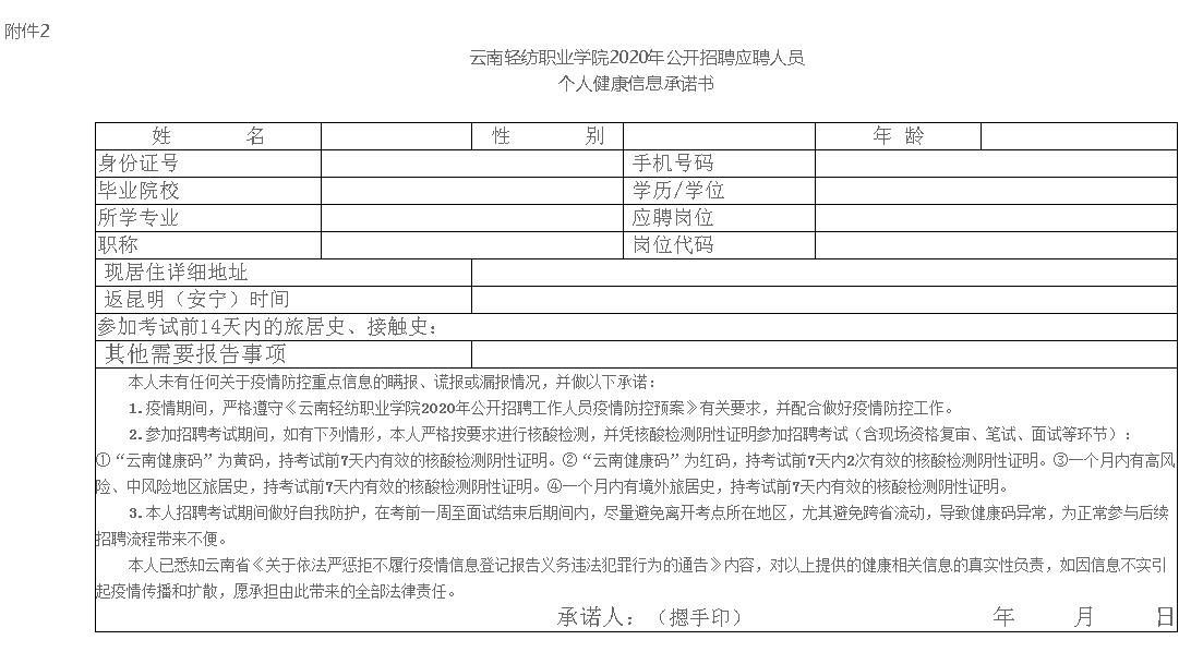2.云南輕紡職業(yè)學(xué)院2020年公開(kāi)招聘應(yīng)聘人員個(gè)人健康信息承諾書(shū)
