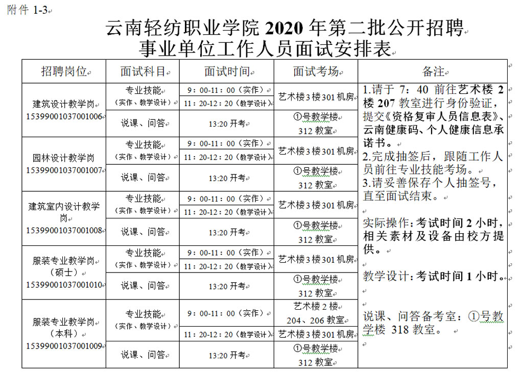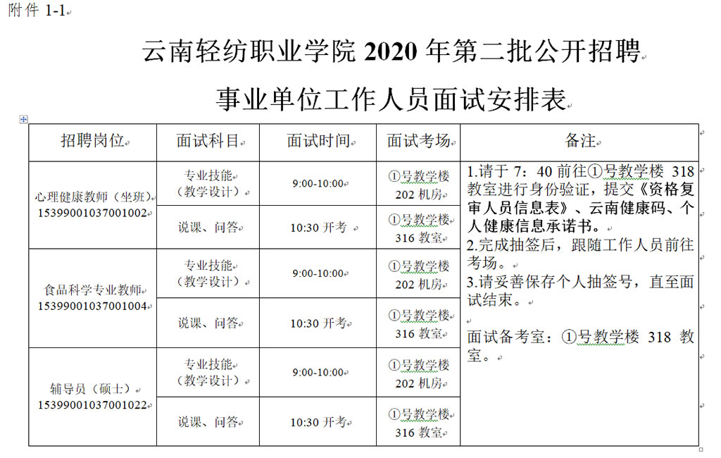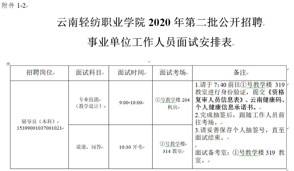 1.云南輕紡職業(yè)學(xué)院2020年第二批公開(kāi)招聘事業(yè)單位工作人員面試安排表