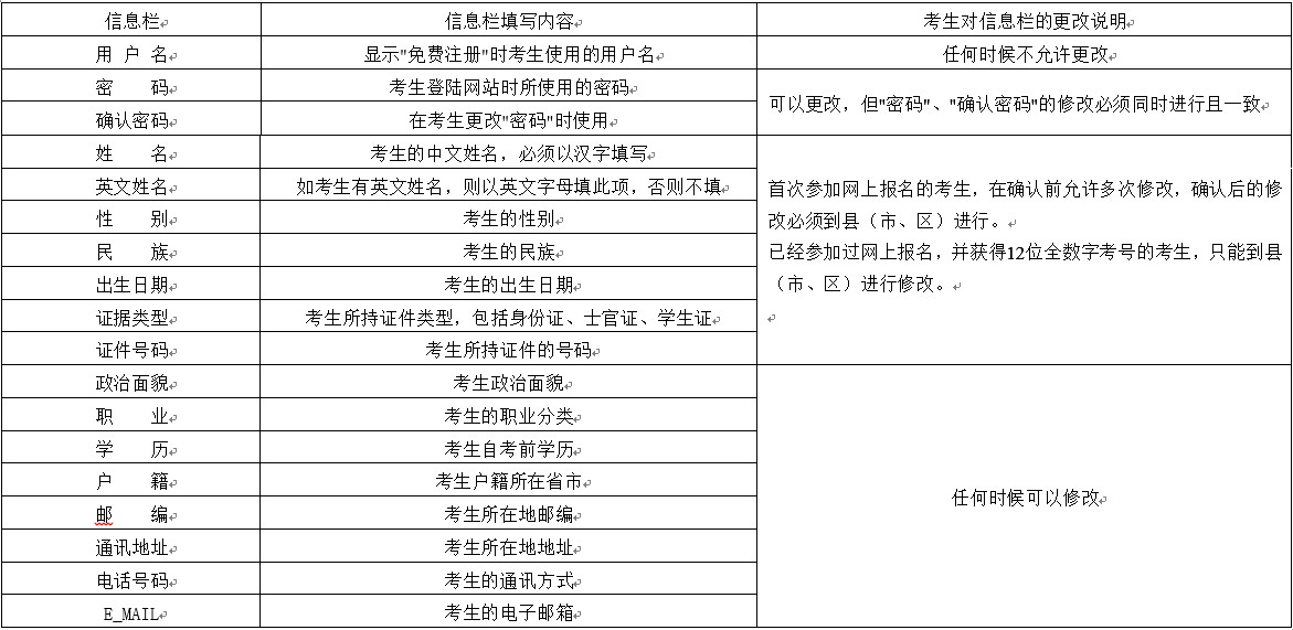 2、首次進行網(wǎng)上報名的考生,必須使用“免費注冊”功能。已經(jīng)參加過自考網(wǎng)上報名的考生,使用已經(jīng)獲得的“12位全數(shù)字考號”作為用戶名,不進行“免費注冊”操作。忘記用戶名或密碼的考生可以到當?shù)乜h(市、區(qū))招生考試機構(gòu)查詢,查詢前要進行身份核實。