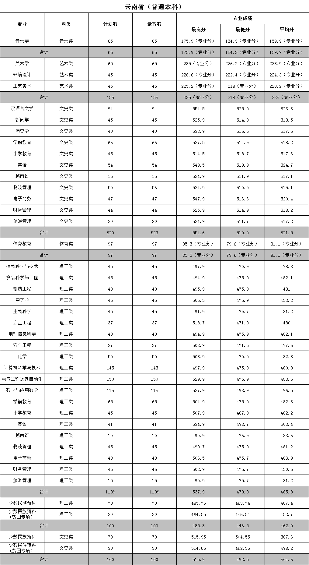 文山學(xué)院2020年招生錄取分數(shù)統(tǒng)計一(云南省本科)