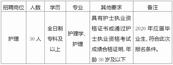 (五)除2020年應(yīng)屆畢業(yè)生外,須具有護(hù)士執(zhí)業(yè)資格或通過資格考試成績(jī)合格證明;2020年應(yīng)屆畢業(yè)生符合此次招聘報(bào)名條件,待當(dāng)年護(hù)士執(zhí)業(yè)資格考試成績(jī)可查詢時(shí),未能提交通過護(hù)士資格考試成績(jī)合格證明的,取消錄用資格。