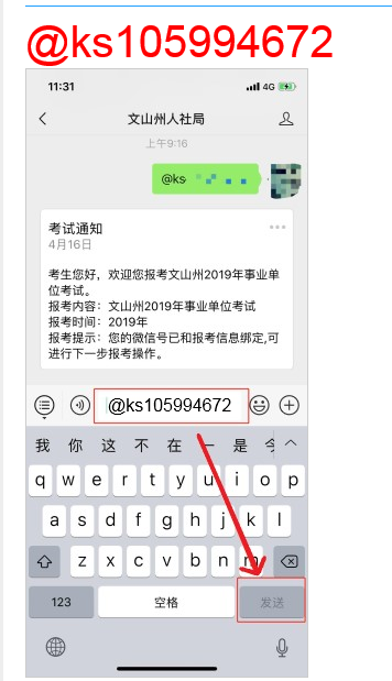 第二步:請(qǐng)將下方@KS和9位數(shù)據(jù)組成的紅色的“驗(yàn)證字符串”(大小寫均可,每位考生驗(yàn)證字符串均不同),發(fā)送到文山州人社局微信公眾號(hào),發(fā)送方法見下圖所示.