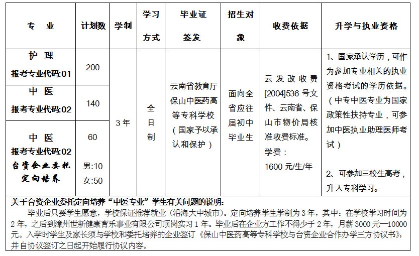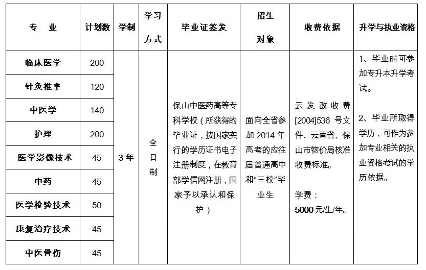 一、保山中醫(yī)藥高等??茖W校2014年招生計劃: