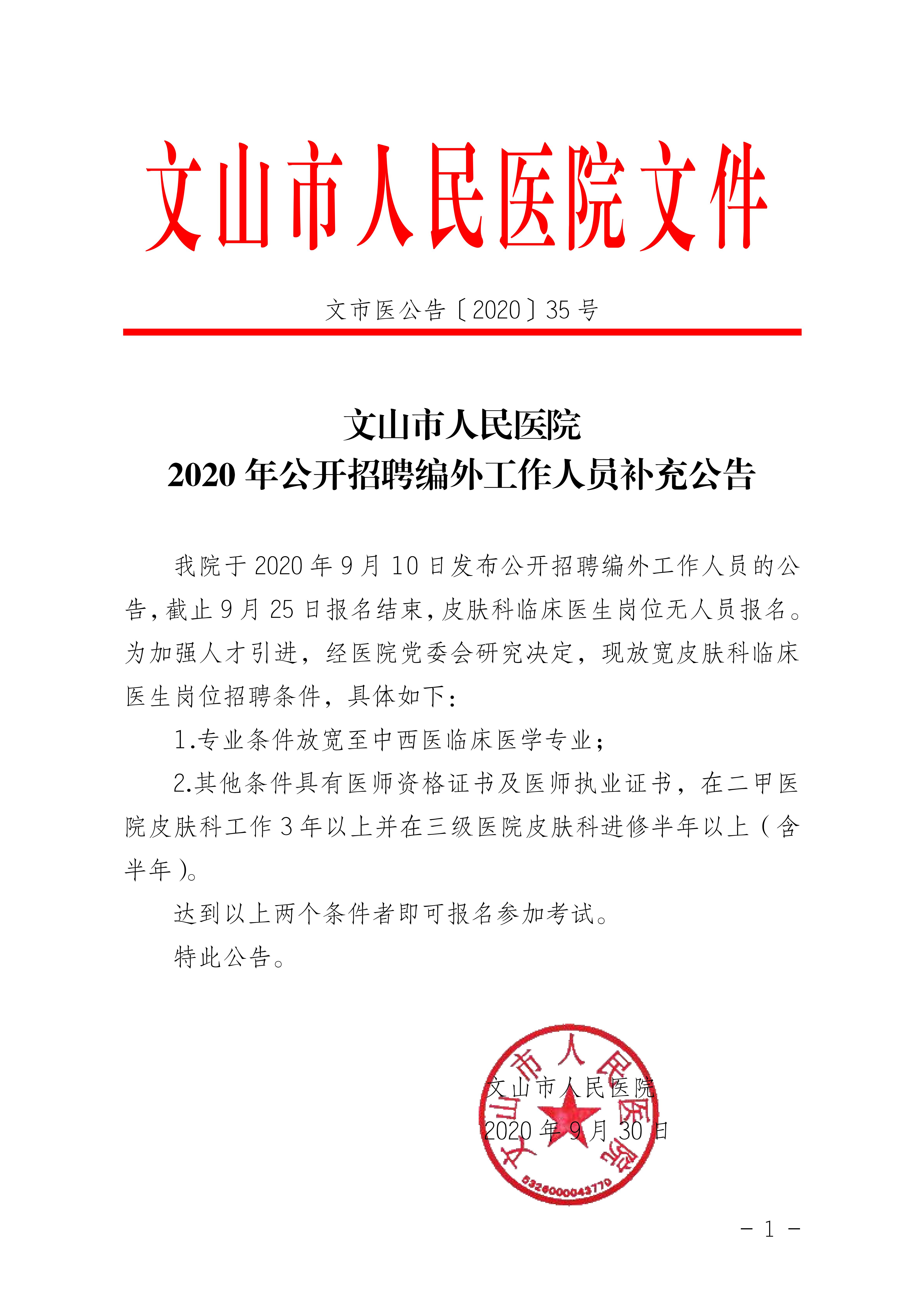文市醫(yī)公告〔2020〕35號文山市人民醫(yī)院2020年公開招聘編外工作人員補充公告