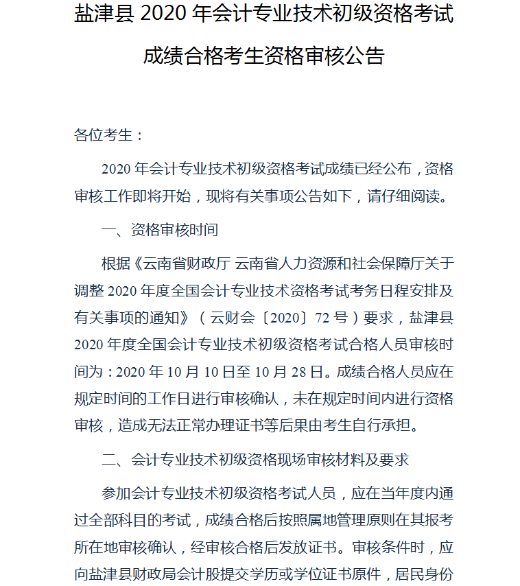 鹽津縣2020年會計專業(yè)技術初級資格考試成績合格考生資格審查公告
